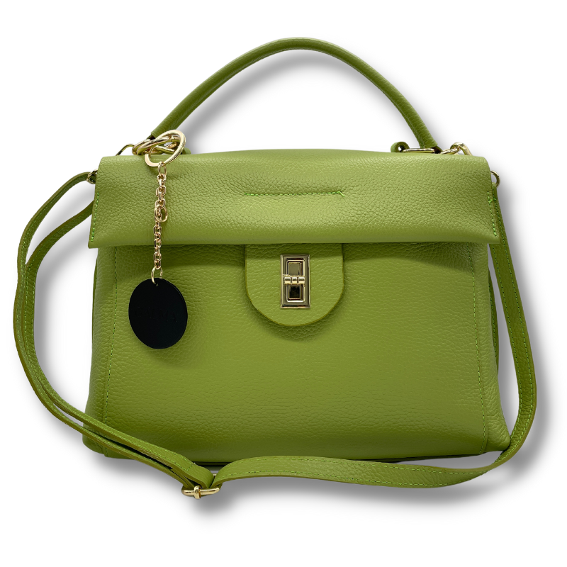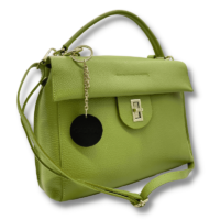 Borsa a mano con tracolla in vera pelle morbidissima, indossabile anche come borsa a tracolla. Chiusura frontale s scatto, internamente ampia con tasca con secondo vano chiuso con cerniera. Finiture color oro.