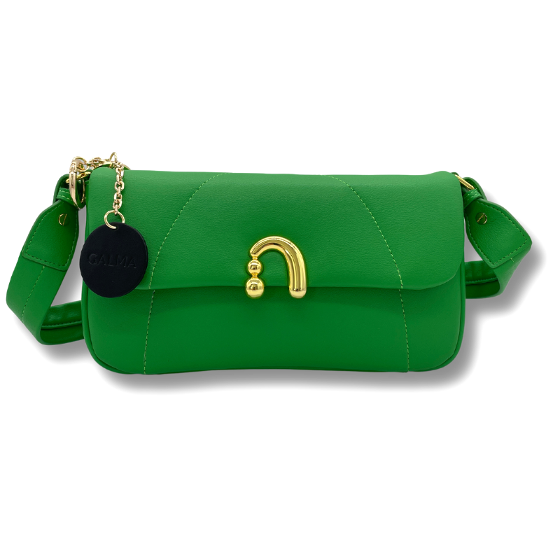 Pochette in morbida pelle con elemento in metallo al centro che nasconde il bottone di apertuta. L’interno della pochette riprendere colore e finiture in vera pelle dell’esterno, così come la tracolla inclusa. Finiture color oro.